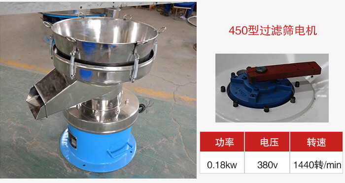 1、450液體過濾篩:電機功率0.18kw,電壓380v,轉(zhuǎn)速1440轉(zhuǎn)每分鐘。