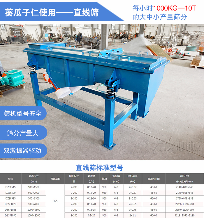 總結(jié):直線篩相比旋振篩的優(yōu)勢(shì)在于篩分產(chǎn)量上的提升,大型號(hào)的直線篩可滿足每小時(shí)10噸的產(chǎn)量求,大產(chǎn)量葵瓜子仁篩分就選直線篩!