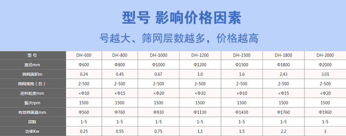 葵花籽不銹鋼振動篩型號有DH400型、DH600型、DH800型、DH1000型、DH1200型、DH1500型、DH1800型、DH2000型。不同大小的型號所配備篩網(wǎng)層數(shù)也不同(可達(dá)到五層),型號越大篩網(wǎng)層數(shù)越多價(jià)格越高。