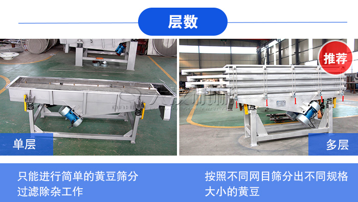 黃豆精選不銹鋼直線篩在篩網(wǎng)安裝的層數(shù)上支持單層和多層,其中最高可達(dá)五層,能篩分出六種不同規(guī)格的物料,功能非常的強(qiáng)大,所以結(jié)構(gòu)越復(fù)雜,價(jià)格就會對應(yīng)增加。