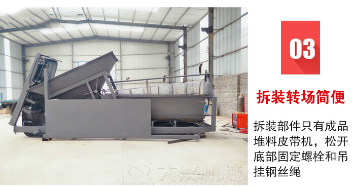 設(shè)備的高度整體性便于施工現(xiàn)場(chǎng)存放或轉(zhuǎn)場(chǎng)運(yùn)輸,拆裝部件只有成品堆料皮帶機(jī),松開底部固定螺栓和吊掛鋼絲繩,將成品皮帶機(jī)塞入主框架底面即可。