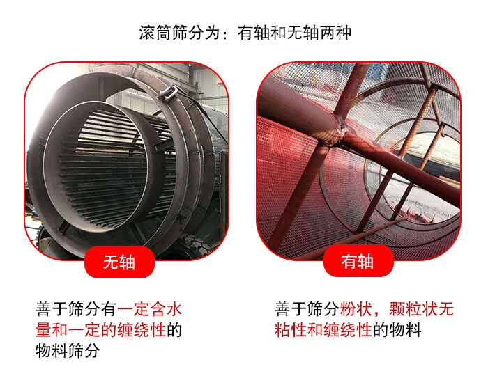 2,根據(jù)所篩分的物料選擇不同結(jié)構(gòu)的產(chǎn)品,對于滾筒篩大致能夠分為:有軸和無軸兩種,有軸的善于篩分粉狀,顆粒狀無粘性和纏繞性的物料。無軸的則是和一些有一定含水量和一定的纏繞性的物料篩分。