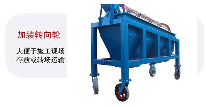 設備的整體性較高加裝轉(zhuǎn)向輪,便于施工現(xiàn)場存放或轉(zhuǎn)場運輸,可拆卸的部件只有成品堆料皮帶機,松開底部固定螺栓和吊掛鋼絲繩,將成品皮帶機塞入主框架底面即可。