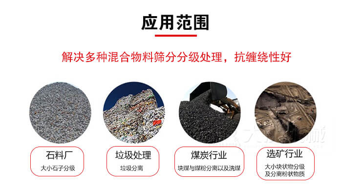 4、采用多層篩網(wǎng)設(shè)計,可篩多種物料。篩下產(chǎn)品大小于100mm,中間10~50mm,細可達≤3mm以下。