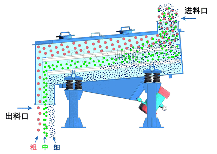 石英砂篩分機(jī)利用振動(dòng)電機(jī)激振作為振動(dòng)源,使物料在篩網(wǎng)上被拋起,同時(shí)向前作直線運(yùn)動(dòng),物料從給料機(jī)均勻地進(jìn)入篩分機(jī)的進(jìn)料口,通過多層篩網(wǎng)產(chǎn)生數(shù)種規(guī)格的篩上物、篩下物、分別從各自的出口排出