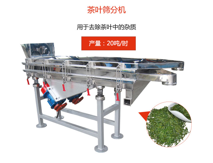 茶葉篩分機(jī)借助雙振動電機(jī)的振動力,帶動篩箱與篩網(wǎng)以及物料在篩網(wǎng)上做拋物線的向前運動,根據(jù)篩網(wǎng)孔徑的大小不同,將物料篩分成不同顆粒大小的成品并在各層篩網(wǎng)中,排出篩箱外。