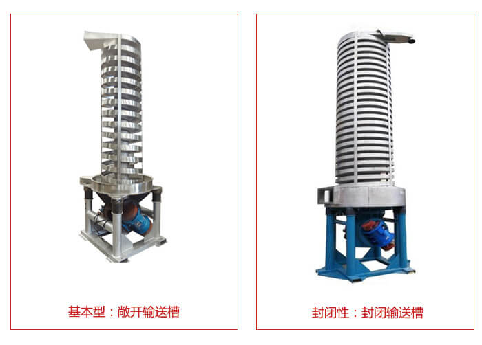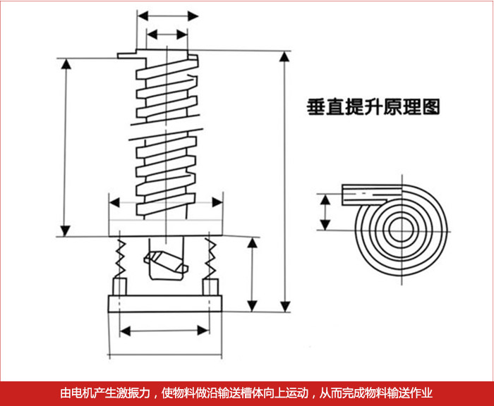 螺旋垂直振動提升機DZC系列垂直振動輸送機的驅(qū)動裝置振動電機安裝在輸送塔下部,兩臺振動電機對稱交叉安裝,輸送塔由管體和焊接在管體周圍的螺旋輸送槽組成,輸送塔座于減振裝置上,減振裝置由底座和隔振彈簧組成。當垂直輸送機工作時,根據(jù)雙振動電機自同步原理,由振動電機產(chǎn)生激振力,強迫整個輸送塔體作水平圓運動和向上垂直運動的空間復(fù)合振動,螺旋槽內(nèi)的物料則受輸送槽的作用,作勻速拋擲圓運動,沿輸送槽體向上運動,從而完成物料的向上(或向下)輸送作業(yè)。