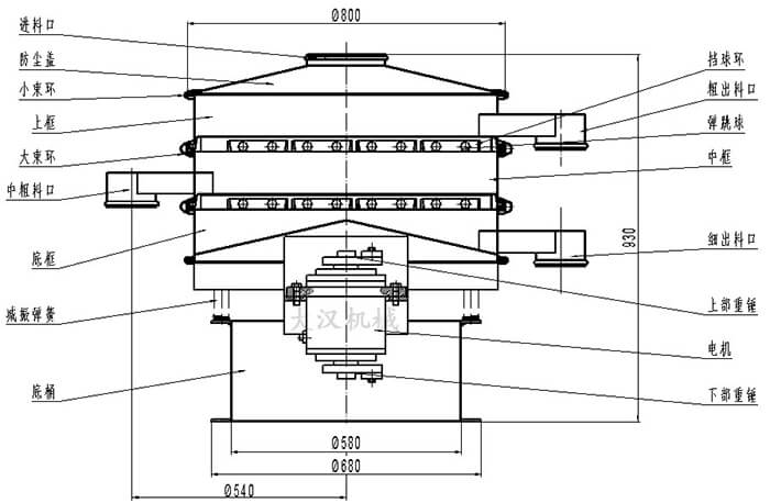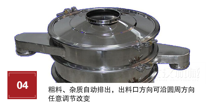 油漆除雜振動篩利用YZUL立式振動電機作為激振源,通過振動電機上下兩端的偏心重錘將旋轉(zhuǎn)運動轉(zhuǎn)變?yōu)樗?、垂直、傾斜的三次元運動,并傳遞到旋振篩的篩面上;物料通過入料口進入設備內(nèi),根據(jù)不同物料篩分要求,物料經(jīng)過1-5層采用不同目數(shù)的金屬編織篩網(wǎng)的篩分層,在這個過程中,位于各層的篩網(wǎng)下的清網(wǎng)裝置(彈跳球)通過頻率振動不斷撞擊篩網(wǎng),使篩網(wǎng)上層物料能夠順暢的透網(wǎng)篩分,并有效解決了物料堵網(wǎng)問題出現(xiàn),不同目數(shù)的物料通過各層對應目數(shù)的篩網(wǎng)后在各層的出料口排出,從而實現(xiàn)篩選除雜或過濾分級的目的。調(diào)節(jié)上、下兩端的相位角,可以改變物料在篩面上的運動軌跡。
